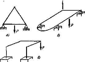 Наряду с плоскими рассматриваются так называемые плоско-пространственные системы. Для такого рода систем оси составляющих элементов в недеформированном состоянии располагаются, как и для плоских систем, в одной плоскости. Внешние же силовые факторы действуют в плоскостях, перпендикулярных к этой плоскости (рис. 2, в). Стержневые системы, не относящиеся к двум указанным классам, называются пространственными (рис.2, в).