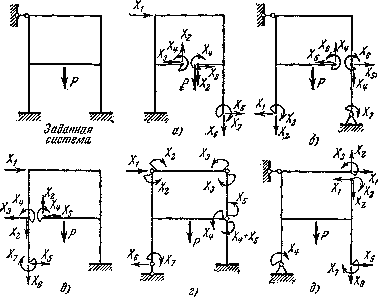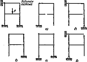 Для каждой статически неопределимой стержневой системы можно подобрать, как правило, сколько угодно основных систем. Например, для рамы, показанной на рис. 1, можно предложить основные системы, а), б),..., которые получены путем отбрасывания семи дополнительных связей в различных комбинациях. Вместе с тем нужно помнить, что не всякая система с семью отброшенными связями может быть принята как основная. На рис. 2 показано три примера для той же рамы, в которой также отброшено семь связей, однако сделано это неправильно, так как оставшиеся связи не обеспечивают кинематической неизменяемости системы, с одной стороны, и статической определимости во всех узлах,— с другой.