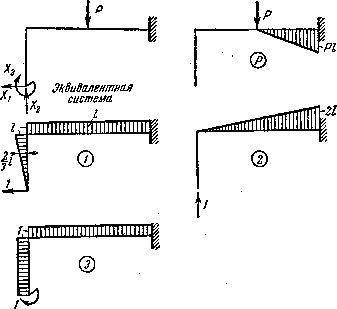 Основная система, к которой приложены все внешние заданные силы и неизвестные силовые факторы, носит название эквивалентной системы. На рис. 3 показано пять эквивалентных систем, которые соответствуют приведенным выше основным системам (рис. 1). Принцип приложения неизвестных силовых факторов становится ясным без дальнейших пояснений.