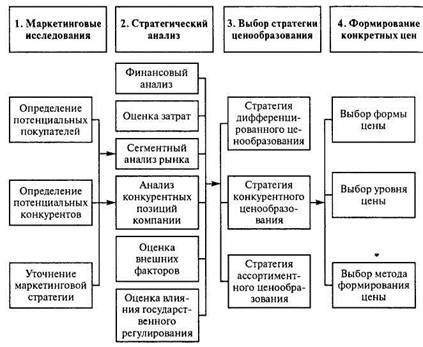 Процесс разработки ценовой политики компании в значительной степени зависит от отраслевой принадлежности и организационно-правовой формы собственности компании. Разработка ценовой политики включает четыре этапа: маркетинговые исследования, стратегический анализ, выбор стратегии ценообразования, формирование цен на товары (услуги) компании (рис. 4.2).