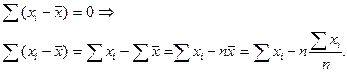 2) Сумма отклонений значений признака от средней арифметической равна 0.