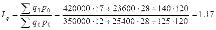 Индекс цены показал нам, что стоимость продукции в текущем периоде по сравнению с базисным сократился на 9% под влиянием изменения цен.