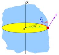 Рис.4.5 | Пусть на твердое тело действует сила . Можно показать, что вращающий момент оси создает только составляющая силы , касательная к траектории точки ее приложения. За время тело поворачивается на бесконечно малый угол и точка приложения силы проходит путь Вектор направлен по касательной к дуге , поэтому работа силы определяется выражением: . (1.4.9) |