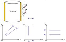 Рис.3.3 | Закон Шарля также описывает линейную зависимость давления газа от температуры. На рис.3.3 изображены , и диаграммы изохорного процесса при различных значениях объема газа. Поскольку в данном процессе объем газа не изменяется ( ), то газ работы не совершает ( ) и вся сообщаемая теплота идет на изменение его внутренней энергии. Первое начало термодинамики имеет вид: |