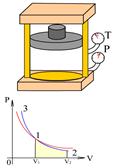 Рис.3.5 | Закон Бойля-Мариотта, установленный экспериментально, дает такую же зависимость. На диаграмме (рис.3.5) такой процесс графически изображается изотермой,имеющей вид равнобочной гиперболы. Внутренняя энергия идеального газа в изотермическом процессе ( ) не изменяется , |