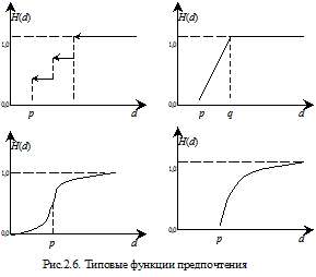 На рис.2.6 приведены несколько видов функций предпочтения. Как правило они имеют два параметра: р – порог безразличия, он отражает тот факт, что если разность