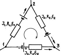 где n – число участков контура. При применении правила (3.8.7) выбирается направление обхода контура. Токи, направления которых совпадают с выбранным направлением, считаются положительными. Положительными также будут э.д.с., создающие ток, имеющий направление обхода контура. В качестве примера применения второго правила Кирхгофа рассмотрим замкнутый контур (рис. 19.3), состоящий из трёх участков.