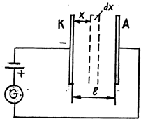 Обратимся к рисунку 19.5. Пусть число вылетающих с поверхности электрода К электронов No. Число электронов, долетающих до слоя dx, находящегося от К на расстоянии X достигает N>No. Тогда число электронов в слое dx