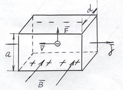 У верхнего края пластины возникает избыток электронов, у нижнего края - недостаток, т.е. между краями пластины возникает поперечное электрическое поле, направленное снизу вверх. Когда напряженность этого поля достигает такой величины, что его действие будет уравновешивать силу Лоренца, то в поперечном направлении устанавливается стационарное распределение зарядов. В этом случае: