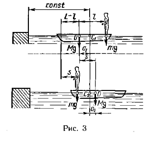 Пример 4. На спокойной воде пруда перпендикулярно берегу и носом к нему стоит лодка массой М и длиной L. На корме стоит человек массой т. На какое расстояние s удалится лодка от берега, если человек перейдет с кормы на нос лодки? Силами трения и сопротивления пренебречь.