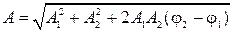 к оси Ох. Результирующее колебание будет происходить с той же частотой ω и амплитудой А, равной геометрической сумме амплитуд A 1 и А 2: А = А 1 + А 2 Согласно теореме косинусов,