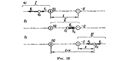 Решение. Заряд Q 1 находится в равновесии в том случае, если геометрическая сумма сил, действующих на него, равна нулю. Это значит, что на заряд Q 1 должны действовать две силы, равные по модулю и противоположные по направлению. Рассмотрим, на каком из трех участков I, II, III (рис. 10) может быть выполнено это условие. Для определенности будем считать, что заряд Q 1—положительный.