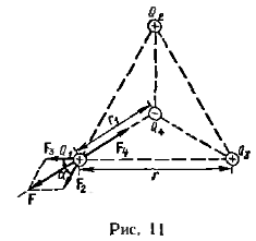 где F 2, F 3, F 4 — силы, с которыми соответственно действуют на заряд Q 1 заряды Q 2, Q 3, Q 4 F — равнодействующая сил F 2 и F 3.