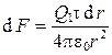 Решение. Сила взаимодействия F заряженного стержня с точечным зарядом Q 1 зависит от линейной плотности τ заряда на стержне. Зная эту зависимость, можно определить τ. При вычислении силы F следует иметь в виду, что заряд на стержне не является точечным, поэтому закон Кулона непосредственно применить нельзя. В этом случае можно поступить следующим образом. Выделим из стержня (рис. 12) малый участок d r с зарядом d Q = τdr. Этот заряд можно рассматривать как точечный. Тогда, согласно закону Кулона,