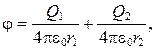 Применяя принцип суперпозиции электрических полей, определим потенциалы φ1 и φ2 точек 1 и 2 поля:
