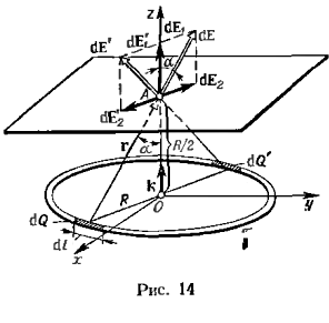 Решение. Совместим координатную плоскость хОу с плоскостью кольца, а ось Oz — с осью кольца (рис. 14). На кольце выделим малый участок длиной d l. Так как заряд d Q = τ d l, находящийся на этом участке, можно считать точечным, то напряженность d E электрического поля, создаваемого этим зарядом, может быть записана в виде