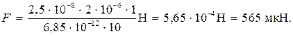 Пример 10. На пластинах плоского конденсатора находится заряд Q = 10 нКл. Площадь S каждой пластины конденсатора равна 100 см2, диэлектрик — воздух. Определить силу F, с которой притягиваются пластины. Поле между пластинами считать однородным.