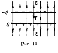 Решение. Заряд Q одной пластины находится в поле напряженностью Е, созданном зарядом другой пластины конденсатора. Следовательно, на первый заряд действует сила (рис. 19)