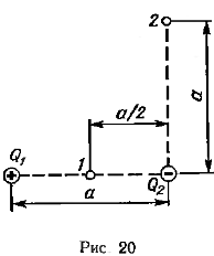 Пример 12. Электрическое поле создается двумя зарядами Q 1 = 4 мкКл и Q 2 = —2 мкКл, находящимися на расстоянии а = 0,1 м друг от друга. Определить работу А 1,2 сил поля по перемещению заряда Q = 50 нКл из точки 1 в точку 2 (рис. 20).