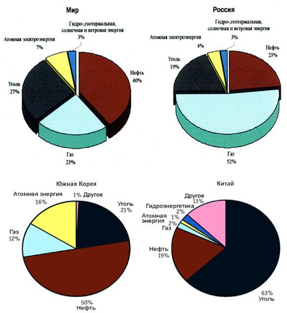 В суммарном энергопотреблении к началу XXI в. в мире доля нефти достигла 40%, углей – 27%, природного газа – 23%. В то же время доля атомной энергии, гидроэнергии, солнечной и ветровой составила всего лишь 10%. Если до 70-х годов в энергопотреблении опережающими темпами росла нефтяная составляющая, то в 80-х годах, после преодоления нефтяного кризиса, в большинстве индустриально развитых стран произошло заметное снижение доли нефти, увеличилась доля углей, природного газа и атомной энергии. Наличие ресурсов углеводородов и уровень технологического прогресса определили весьма «пеструю» картину структуры потребления энергетических ресурсов в мире (рис.1.1.).
