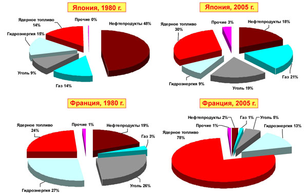 Страны, взявшие курс на развитие атомной энергетики – Франция, Япония и ряд других за 25 лет коренным образом изменили энергетический баланс своей экономики и достигли выдающихся успехов в конверсии углеводородной энергетики, существенно подняли роль атомной энергетики, решили важные экологические проблемы (рис. 1.2.).
