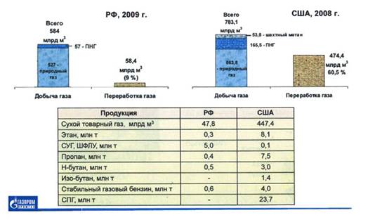 Состояние с переработкой газа в РФ и США в 2008 г. представлено «Промгазом» на рис. 1.7.