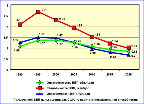 Опыт многих стран, решивших удовлетворительно эту задачу, свидетельствует, что главный резерв в снижении потребления топливно-энергетических ресурсов заключен в структурной перестройке экономики, ориентированной на снижение энергоемкости ВВП. При этом мы должны иметь в виду, что к 2020 г., при планируемом значительном объеме экспорта топливно-энергетических ресурсов, медленном развороте структурной перестройки экономики страны и отставании геологоразведочных работ, контрольная цифра внутреннего потребления этих ресурсов на наш взгляд, может быть близкой к 2,0 млрд. т условного топлива в год.