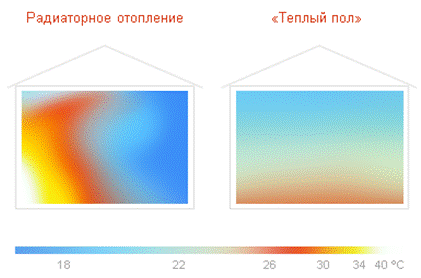 Равномерное распределения тепла, помимо комфорта, позволяет использовать более низкие температуры теплоносителя: в водяных теплых полах она составляет 30-50 °С (в радиаторе 75-95 °С), в зависимости от применяемых покрытий пола, типа укладки трубы, теплопотерь помещения и требуемой тепловой нагрузки.