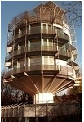 Главной экологической новинкой стал «вращающийся зелёный дом» «Гелиотроп», признанный специалистами одним из самых экологичных домов в мире (рис. 4.50.). Мало того, что дом этот стоит всего лишь на одной «ножке», он ещё и медленно поворачивается вслед за солнцем. Таким образом, огромные солнечные батареи на крыше дома воспринимают максимум энергии.