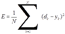 Удачный выбор меры погрешности упрощает задачу обучения нейронной сети, так как обычно приводит к более гладкой поверхности невязки. Часта, в качестве меры погрешности берётся средняя квадратичная ошибка. Она определяется как сумма квадратов разности между желаемой величиной выхода “dk” и реально полученными на нейронной сети значениями “yk” для каждого примера K.