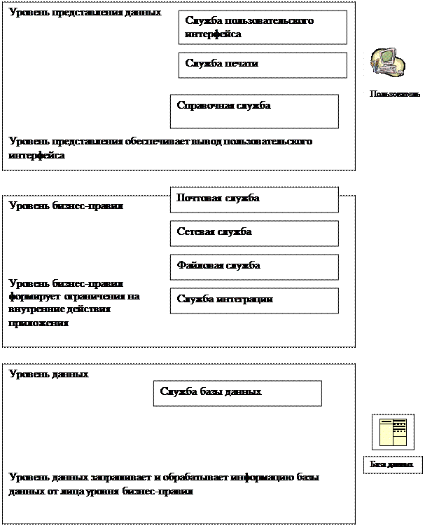В любом приложении можно выделить прикладные службы. Трехуровневая модель делит прикладные службы на три категории: представление, бизнес-правила, данные), организованные таким образом, чтобы максимально повысить эффективность совместной работы. Уровни и соответствующие им службы образуют следующую структуру:
