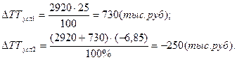 ΔТПусл2 = ТП1- ТПусл1 = 3400 - 3650 = - 250 (тыс. руб.).