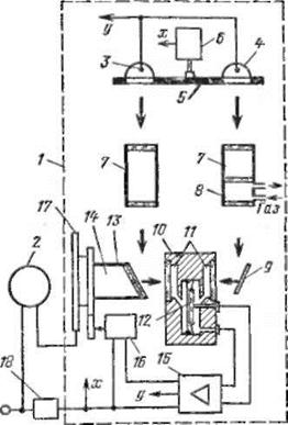 реверсивного двигателя, вал которого через редуктор может перемещать поршень; 17 — реохорда, включенного в мостовую измерительную