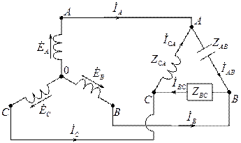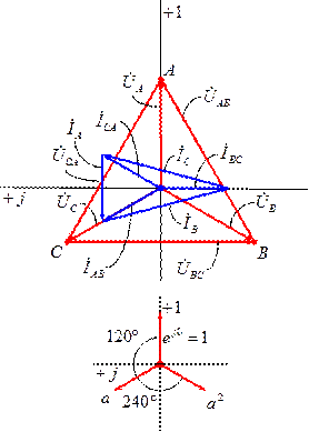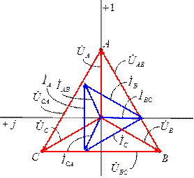 Линейные токи определяются через фазовые токи по первому закону Кирхгофа, то есть: