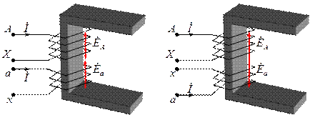 Если у одной из обмоток поменять начало и конец, то индуцированные магнитными потоками МДС будут прямопротивоположенными по фазе.