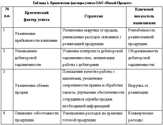 При помощи руководства компании «НП Трейд» эксперты составили список критических факторов успеха (табл.1). Увеличение прибыльности компании было названо главной целью компании, а три других фактора конкретизируют стратегию ее достижения.