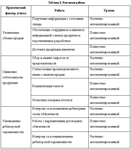 Следующая задача - идентификация работ, наиболее значимых для достижения критических факторов успеха, в соответствии с выбранной стратегией. Работы подразделяются на три группы, по степени автоматизации (табл.2):
