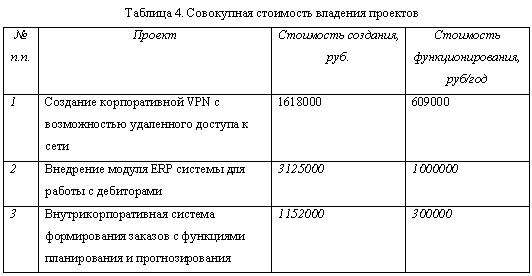 Поскольку деятельность ИТ-службы ОАО «НП Трейд» слабо формализована, и прошлый опыт не накапливается на регулярной основе, для оценки стоимости затратных составляющих проектов был использован упрощенный метод ТСО (табл. 4). При расчетах стоимости проектов учитывались две компоненты: