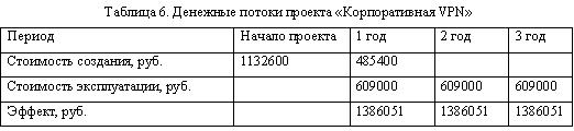 Прибыли и затраты описываются традиционными, для финансовых планов, проектами денежных потоков для каждого решения. Так проект корпоративной VPN предполагает следующее распределение затрат на создание сети: 70% – предоплата в текущем году, и 30% – в следующем году, после начала функционирования системы. Денежные потоки проекта «Корпоративная VPN» представлены в таблице 6.