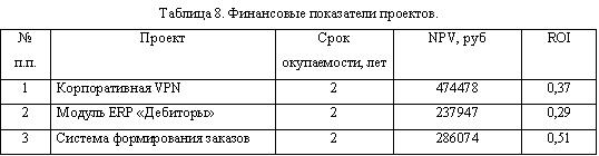 Поскольку информационные технологии динамично развиваются, аналитики приняли срок жизни проектов равным четырем годам. Исходя из этого, были рассчитаны финансовые показатели эффективности, принятые на ОАО «НП Трейд»: срок окупаемости, чистый приведенный доход и возврат от инвестиций. Полученные результаты для каждого проекта приведены в таблице 8.