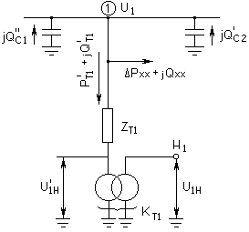 Так как напряжение U1 известно (определено на предыдущем этапе расчета), то потеря напряжения в сопротивлении трансформатора Zт1 может быть найдена по величине напряжения U1 и мощности