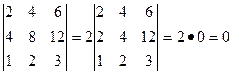 Из свойств 3 и 4 следует, что если все элементы некоторого ряда пропорциональны соответствующим элементам параллельного ряда, то такой определитель равен 0