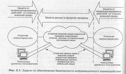 Безопасность информационного взаимодействия локальных сетей и отдельных компьютеров через открытые сети, например, через сеть Internet, требует качественного решения двух базовых задач (рис. 3.1):