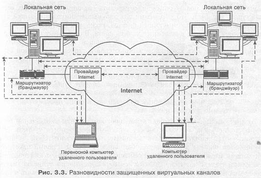 Поэтому, если отсутствует необходимость защиты трафика внутри локальной сети, входящей в виртуальную сеть, то в качестве конечной точки защищенного туннеля целесообразно выбрать брандмауэр или пограничный маршрутизатор этой локальной сети. В случае же, когда внутри локальной сети поток сообщений также должен быть защищен, то в качестве конечной точки туннеля в этой сети должен выступать компьютер, представляющий одну из сторон защищенного взаимодействия. При доступе к локальной сети удаленного пользователя компьютер этого пользователя также должен быть конечной точкой защищенного виртуального канала.