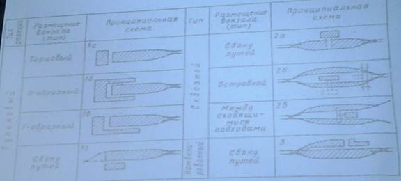 По взаимному расположению станции основных пассажирских устройств бывают 8 видов: