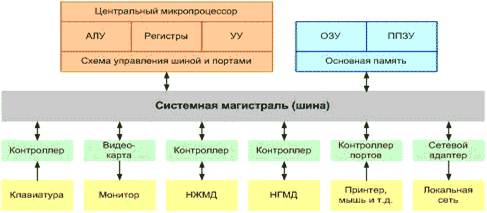 Основным устройством ПК является материнская плата, которая определяет его конфигурацию. Все устройства ПК подключаются к этой плате с помощью разъемов расположенных на этой плате. Соединение всех устройств в единую систему обеспечивается с помощью системной магистрали (шины), представляющей собой линии передачи данных, адресов и управления.