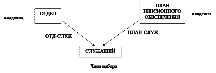 В любом сетевом наборе только один тип записи является владельцем. Членами набора могут быть несколько типов записи. Кроме того, как видно из рисунка служащий является типом записи члена набора для двух наборов. В иерархической модели никакой тип записи не может быть членом двух разных наборов.