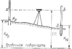 Между точками А и В устанавливают нивелир и, взяв отсчет по рейке на точке А, находят горизонт прибора