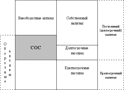 Заштрихованная часть схемы на рис. 1.1.5 отображает величину имеющихся у предприятия СОС. Как видно из схемы, название “собственные оборотные средства” не совсем точно отражает природу этого показателя. Речь идет о той части оборотных активов предприятия, которая покрывается не только собственным капиталом, но и долгосрочными пассивами, т.е. постоянным капиталом. В мировой практике для обозначения этой части оборотных средств используется термин “working capital” или “net working capital” – рабочий (работающий) или чистый рабочий капитал. Как видно из схемы, алгебраически величину СОС можно рассчитать двумя способами: