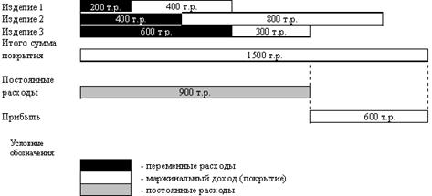В ходе обоснования текущих решений о формировании производственной программы предприятия, в нее должны включаться все изделия, дающие положительный вклад на покрытие постоянных расходов (маржинальный доход), а не только те, полная себестоимость которых ниже продажной цены изделия. Упрощенная схема обоснования подобных решений представлена на рис. 3.2.1. Как следует из схемы, ни одно из трех планируемых к выпуску изделий не в состоянии покрыть всех постоянных расходов предприятия (900 тыс. рублей). Однако суммарный маржинальный доход по всем трем изделиям составляет 1 млн. 500 тыс. рублей, т.е. предприятие не только покрывает свои фиксированные издержки, но и получает прибыль в сумме 600 тыс. рублей (1500 – 900).